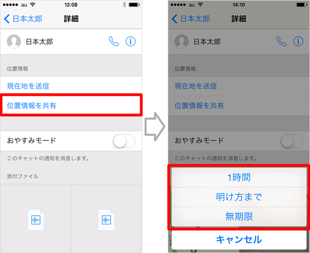 指定した期間中、自分の現在地を相手に共有できるようになりました。《詳細》画面で【位置情報を共有】をタップして、期間を選ぶと共有されます。