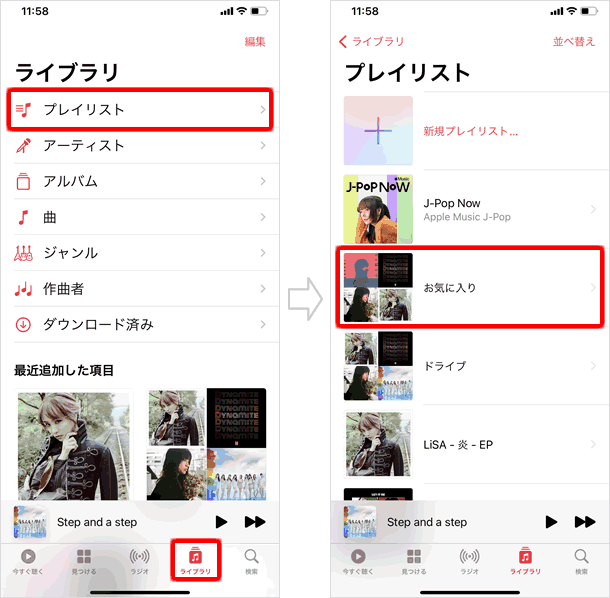 画面下のタブから[ライブラリ]を選択して、[プレイリスト]をタップします。