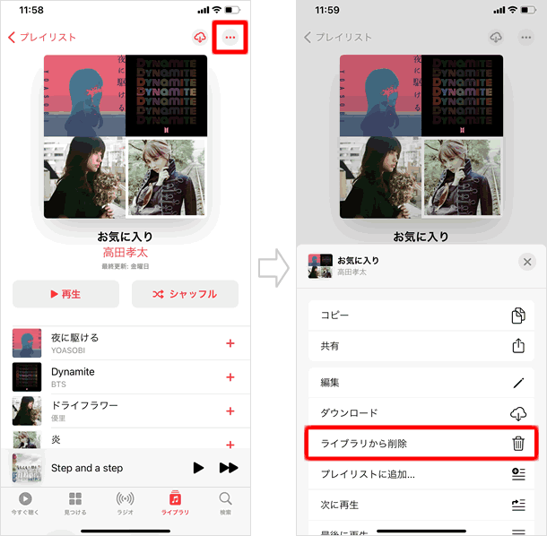 削除するプレイリストを表示させ、右上の[...]をタップします。表示されたメニューの[ライブラリから削除]をタップで、プレイリストの削除が完了です。