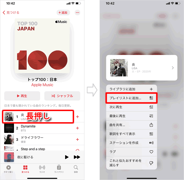 プレイリストに追加したい曲を長押しし、表示されたメニューの[プレイリストに追加...]をタップします。